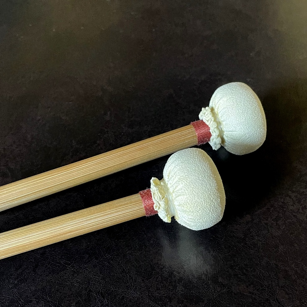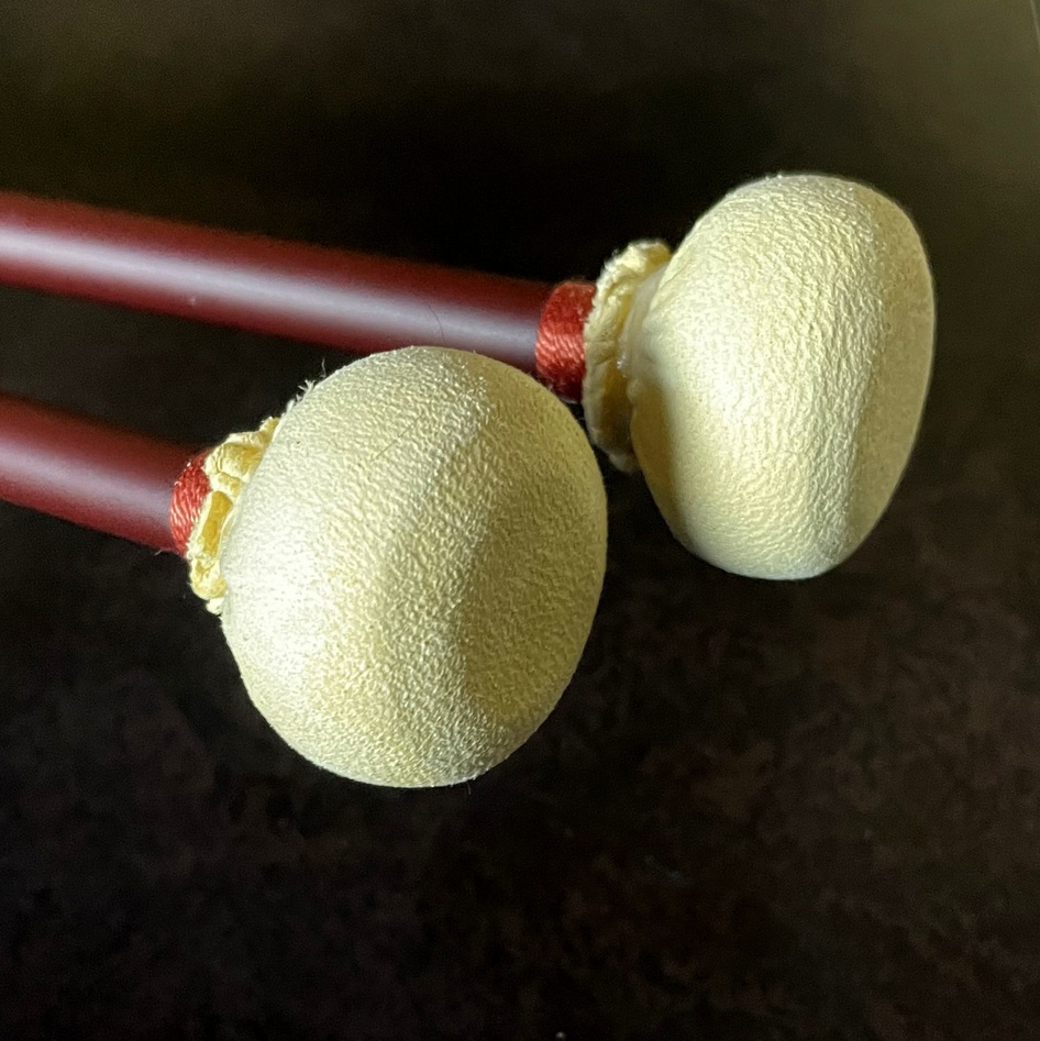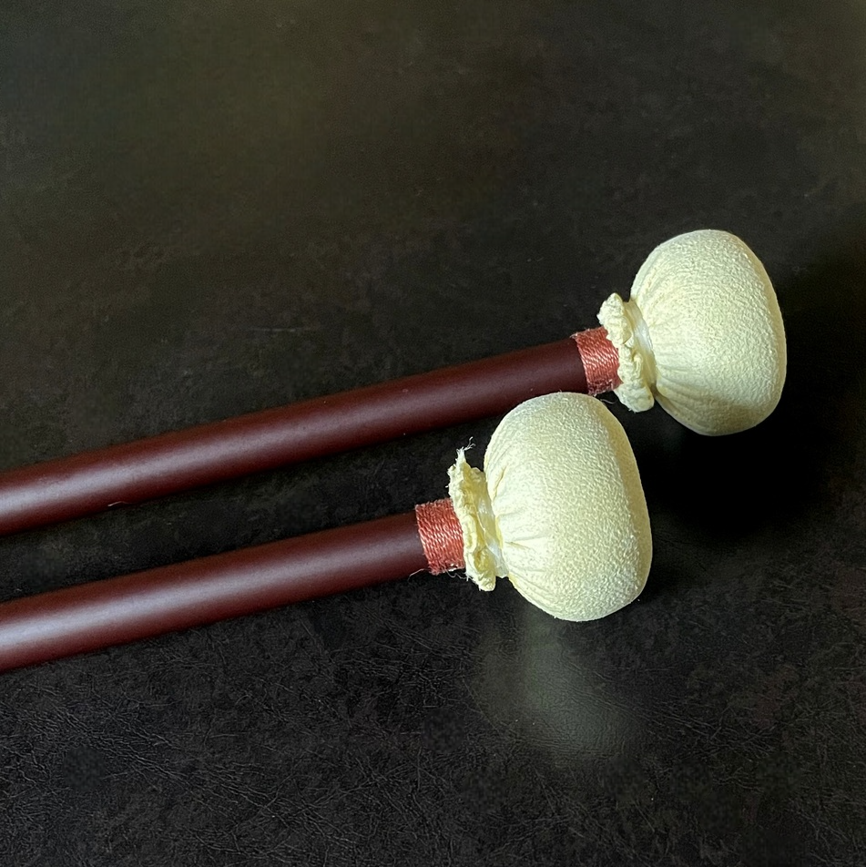 バロックティンパニのみならず、モダンティンパニにおけるヒストリカル・アプローチにも最適なバチを追求しました。音の輪郭を保ちながら、ティンパニらしい響きが自然に立ち上がります。中心から外側に向かって 木 → コルク → 綿テープ → セーム革 という順で、外側に向けて硬度が段階的に移行する構造を取っています。全長約360mm。頭部径約36mm。重量約28g~30g。