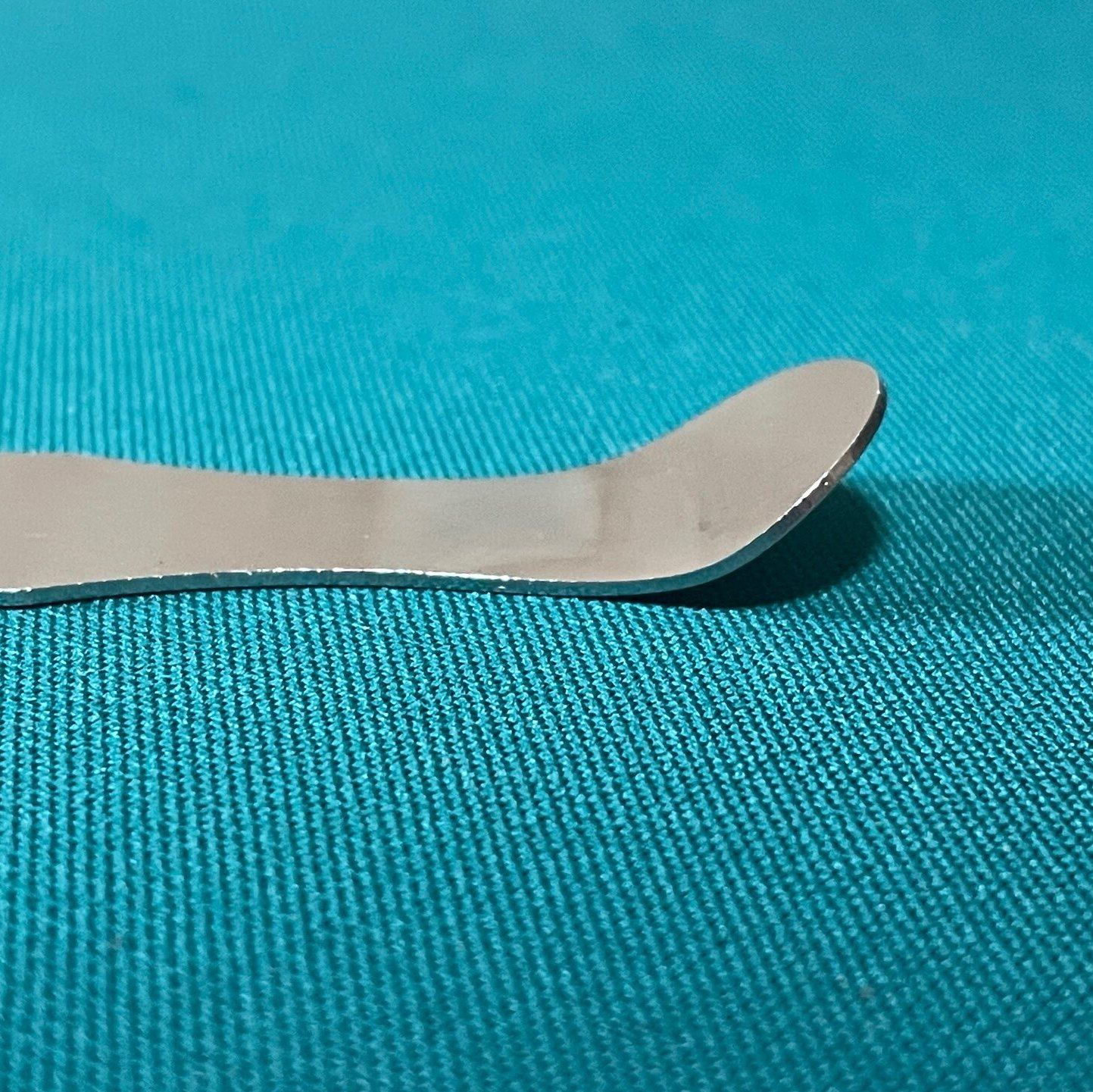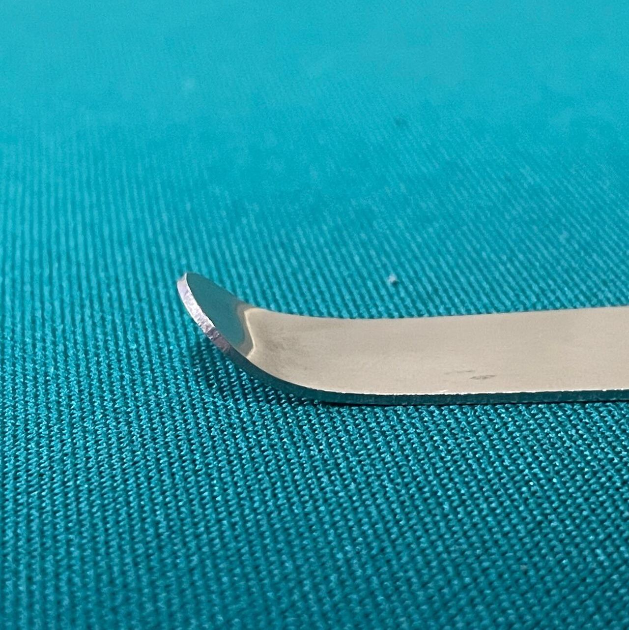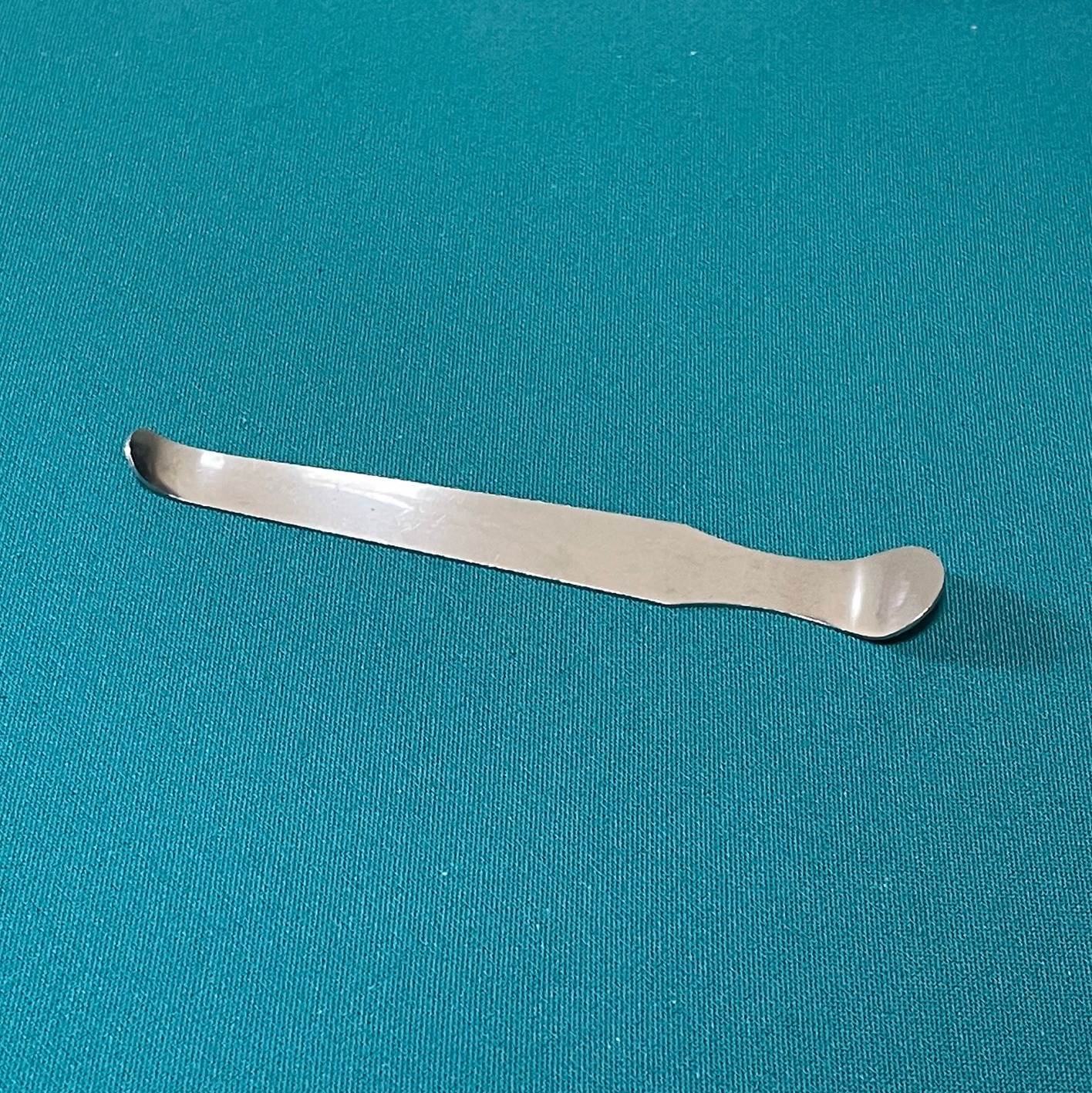 当工房も実務で使用している、本皮をフープにタッキングするヘラです。両先端に曲げ加工を施してあります。材質はステンレススチール。先端幅は、10mm(細端)、18mm(太端)。長さ約135mm。厚み約1mm。